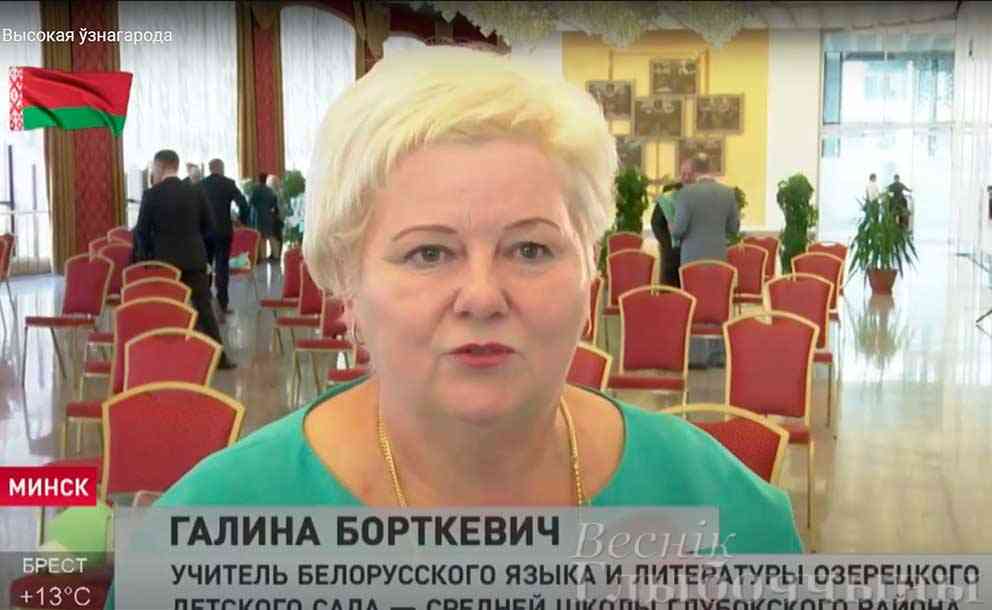 Торжественная церемония, на которую приглашались более 50 работников системы образования, проходила во Дворце Республики. Среди награжденных была и наша землячка, учительница белорусского языка и литературы Озерецкой детский сад-средней школы Глубокского района Галина Михайловна Борткевич. За многолетний добросовестный труд по обучению и воспитанию подрастающего поколения она награждена медалью “За трудовые заслуги”.