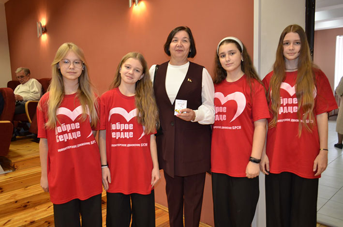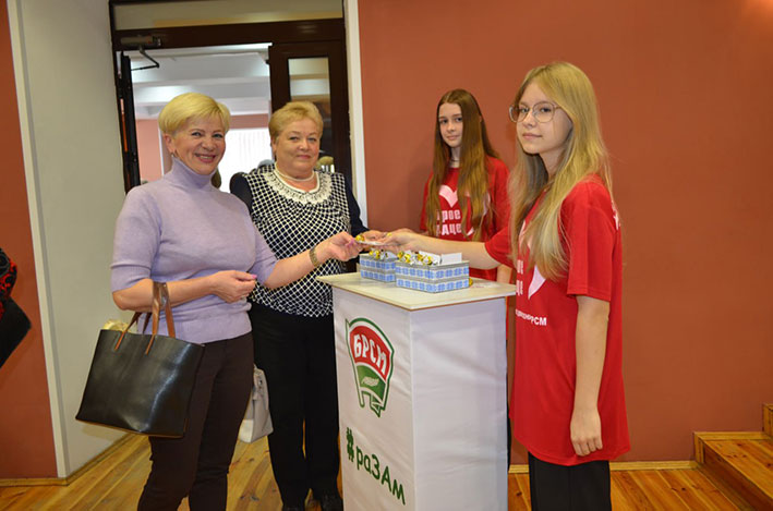 Гостей праздника встречали волонтёры районной организации БРСМ, восьмиклассницы СШ№2 города Валерия Якубёнок, Дарья Полянина, Мария Глаз и Дарья Зуй.
